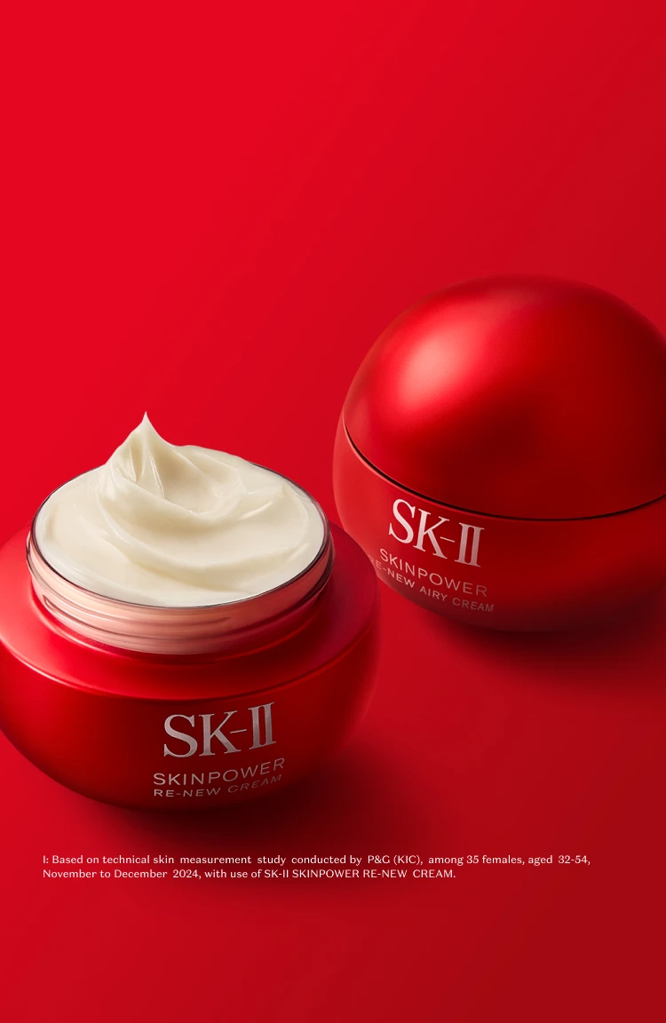 - Based on technical skin measurement study conducted by P&G (KIC), among 35 females, aged 32-54, November to December 2024, with use of SK-II SKINPOWER Re-New Cream.